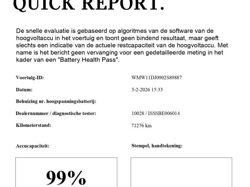 Battery state of health 99% Sensatec leder zwart 0230 Extra pakket EU-specifiek 0249 Multifunctie v stuurwiel 0255 Sportstuurwiel leder 02GZ MINI LM-velg Victory Spoke zwart 02PA Wielbout met slot 02VB Bandenspanningsweergave 0302 Alarmsysteem 0313 Buitenspiegel elek. inklapbaar 0322 Comforttoegang 0329 Motorkapstreep zwart 0383 Dak en spiegelkappen zwart 03AG Achteruitrijcamera 03L2 Piano black exterieur 0402 Panoramadak elektrisch 0420 Verduisterde ruiten achter 0423 Vloermat velours 0431 Binnenspiegel, automatisch dimmend 0450 Hoogteverstelling bijrijdersstoel 0470 Isofix-System 0473 Armsteun voor 0481 Sportstoel 0493 Opbergpakket 0494 Stoelverwarming bestuurder/passagier 04AA Dakhemel antraciet 04E8 MINI YOURS interieuroppervlak alu 04T9 Warmtepomp 04U6 AC laadpunt Professional 04U7 Snelladen gelijkstroom 04U9 Akoestische voetgangersbescherming 04UR Sfeerverlichting 04VA MINI Driving Modes 0507 Park Distance Control PDC , achter 0521 Regensensor 0534 Automatische airco 0544 Snelheidsregeling met remwerking 0548 Kilometersnelheidsmeter 0550 Boordcomputer 0563 Lichtpakket 05A2 LED-koplamp 05AA Mistachterlicht 05AS Driving Assistant 0654 DAB-ontvangermodule 06AE Teleservices 06AF Wettelijke noodoproep 06AG eDrive diensten 06AK Connected Drive Services 06AM Real-Time Traffic Information 06AP Remote Services 06CP Smartphone-integratie 06FP Radio MINI Visual Boost 06NM MINI Connected 06UM MINI navigatiesysteem 06WB Multifunctioneel instrumentendisplay 0785 Knipperlichten wit 07EA Classic uitvoering 07ED Comfortpakket Plus 07EE Bestuurdersassistentiepakket 07GH Connected Navigation 08S3 Autom. vergrendeling bij wegrijden A050 AGM-accu 50 Ah